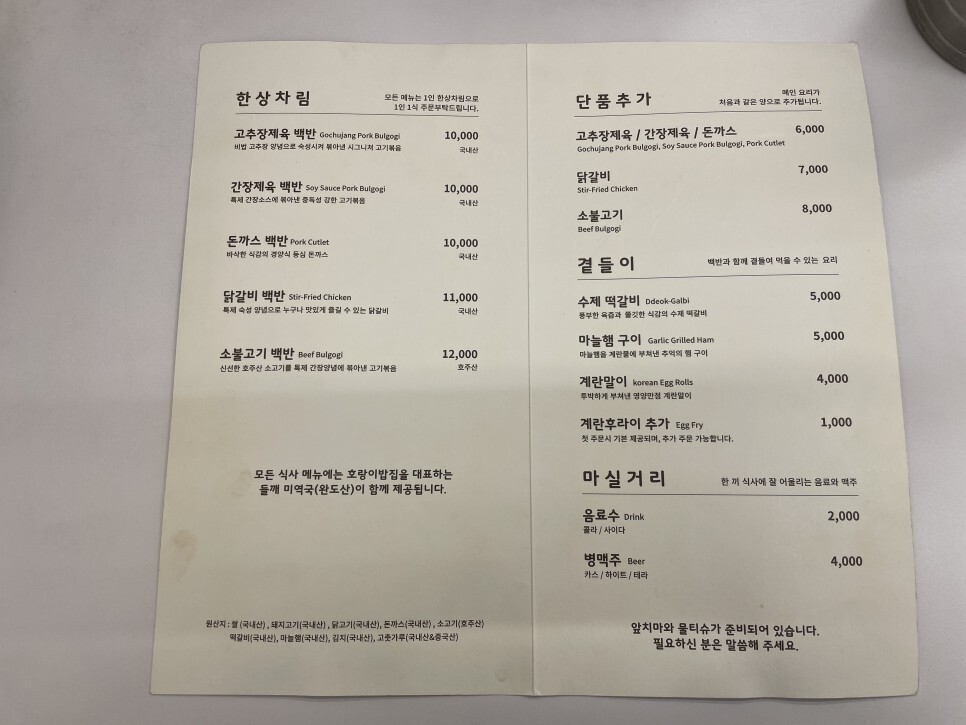 호랑이밥집의 모든 메뉴는 깔끔하게 먹을 수 있는 한상 차림으로 나오는데요. 더 먹고 싶은 주요 반찬들은 추가를 하여 먹을 수 있어서 좋았어요. 또한 모든 메뉴의 재료들은 원산지가 표기되어 있어서 더욱 신뢰가 갔습니다.
