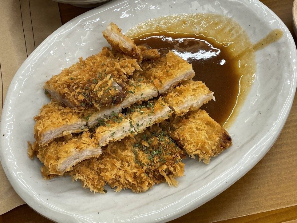 메인 반찬인 간장 제육과 돈가스 모두 양이 푸짐하여 밥을 다 먹을 때까지 넉넉하게 먹을 수 있었습니다. 간장 제육은 호랑이 밥집만의 특제 간장 소스로 볶아낸 것으로 직원분들의 추천 메뉴라고도 합니다. 유명한 메뉴 중 하나인 만큼 간이 세지 않고 달달하고 짭짤한 맛을 느낄 수 있었습니다. 돈까스는 등심 돈까스로 적당한 두께와 바삭함을 가지고 있어서 어린 아이가 먹기에도 안성 맞춤 같아 보였습니다.