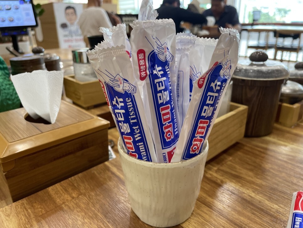 테이블마다 들깨가루, 소금, 후추, 물티슈 등이 놓여 있습니다.