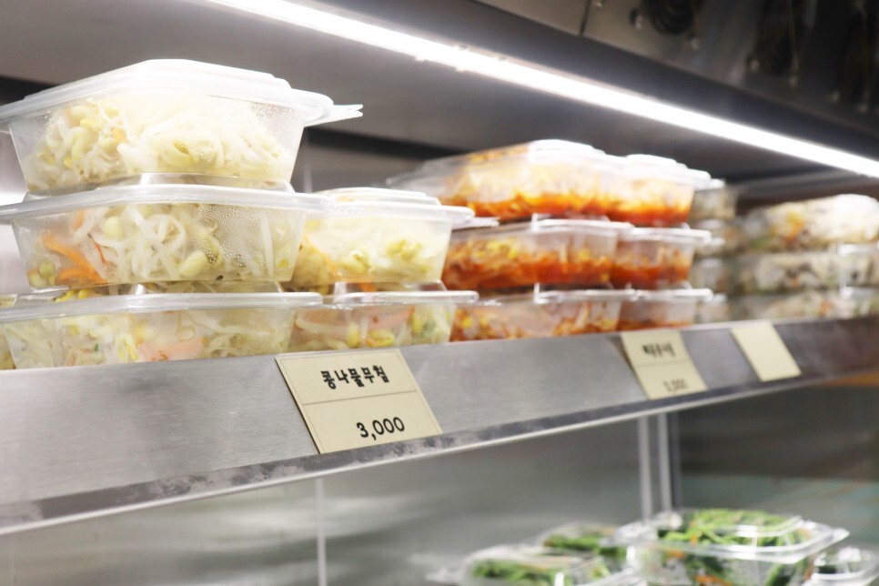 그 밖에도 다양한 반찬들이 가득~~가득 했습니다. 온 가족이 둘러앉아 맛있게 먹을 수 있는 돼지갈비찜도 판매하고 있었고 '파김치', '물김치', '배추김치' 등 김치도 종류별로 판매하고 있었습니다. 큰 용기에 가득 들어 6,000원이면 괜찮은 가격같았습니다. 직장맘이거나 1인 자취생 등 집에서 끼니를 해결해야하는 많은 사람들에게, 마음에 드는 반찬 몇개 구입해서 밥만 떠서 맛있는 식사를 해결할 수 있을 것 같아보였습니다.