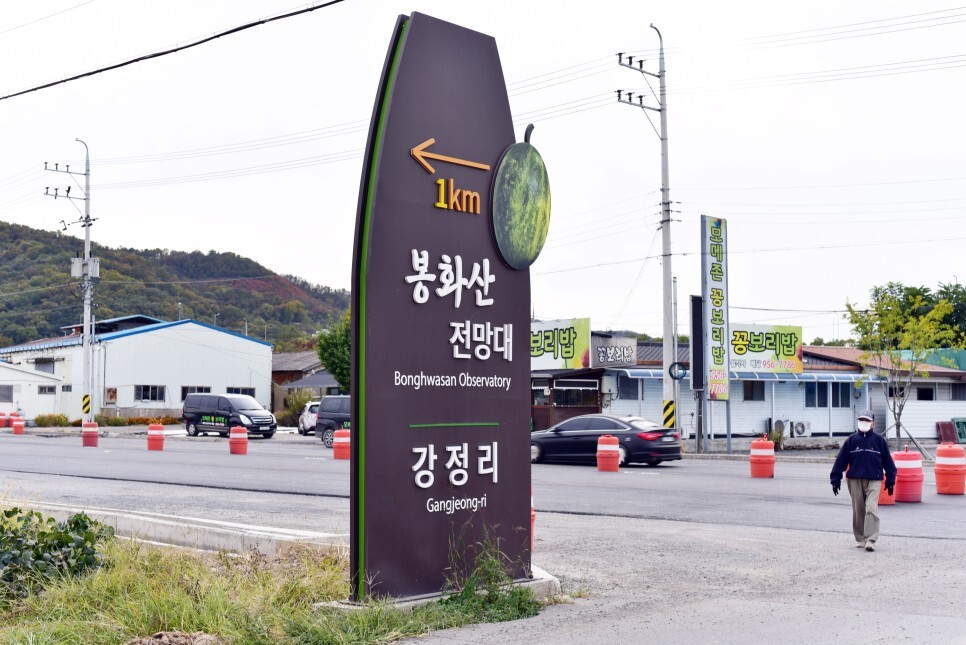 봉화산 전망대 안내 입간판을 만날 수 있습니다.