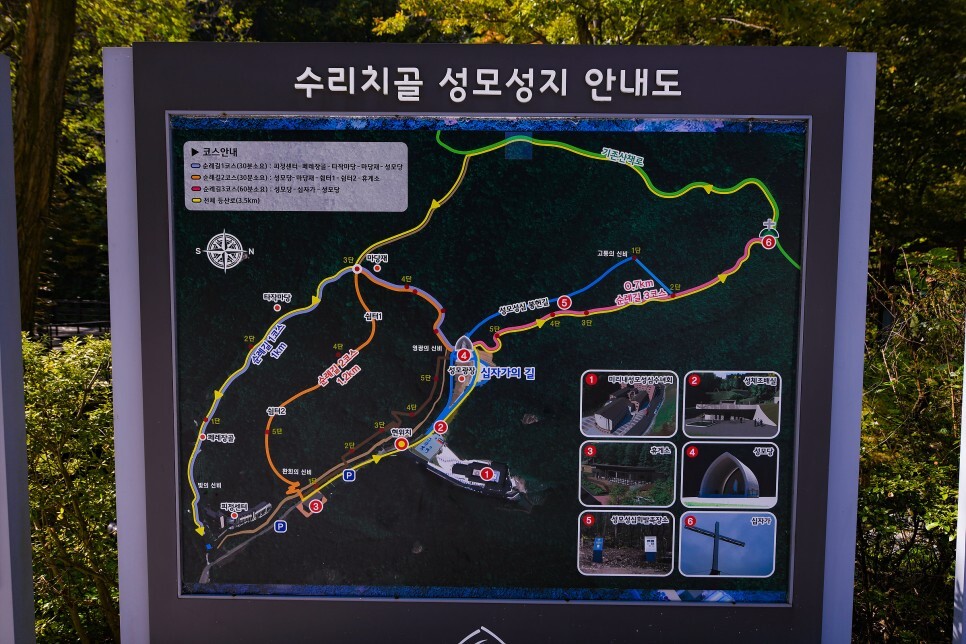 수리치골 성모성지 안내도도 있네요. 여기를 보면 자세히 알 수 있습니다. 우리는 나무데크 따라 휴게소에서 산책을 시작해서 십자가의 길과 성모당까지만 다녀왔습니다. 30분 정도 걸리네요.