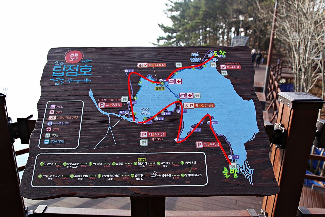 오늘 드라이브 코스는 국방대학교를 출발해 사진 하단의 제5주차장 쪽에서 출발해 1주차장이 있는 탑정호수변생태공원으로 돌아봅니다.