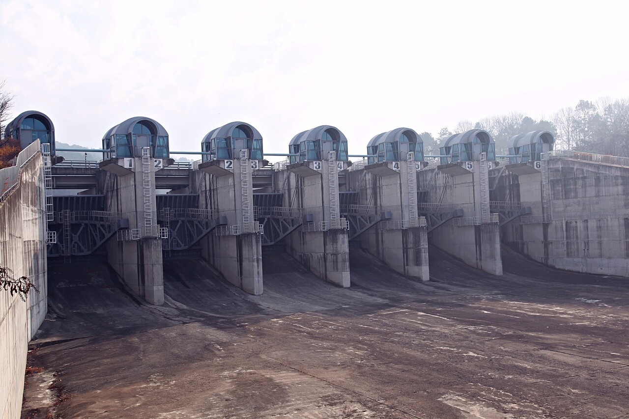 탑정호 수문입니다. 한국수자원공사에서 물관리를 하고 있습니다. 야간에 여러가지 색으로 변하는 조명이 비친 수문의 모습도 정말 아름답답니다.