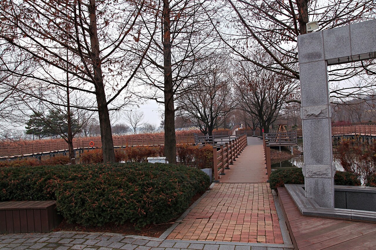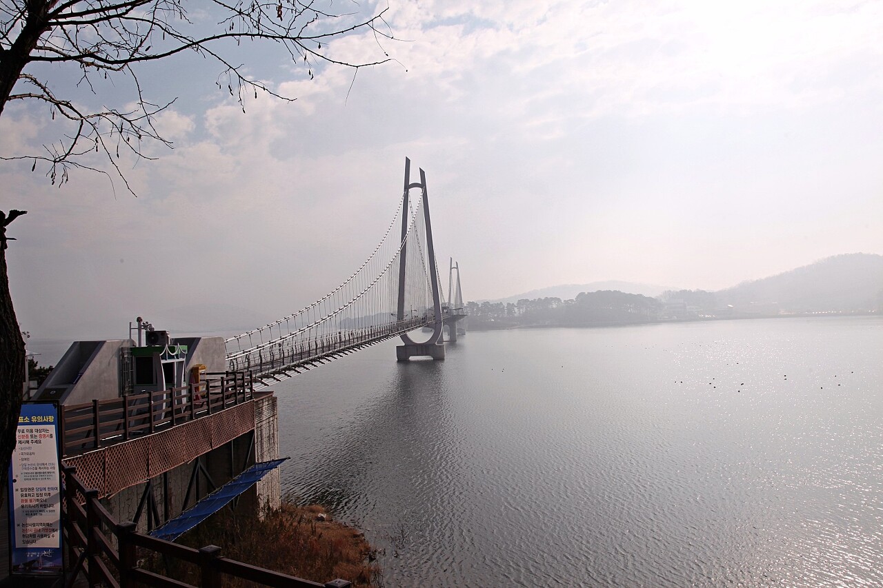 탑정호 북쪽 입구입니다. 저 반대편 남쪽 입구를 지나와 이곳에 도착했네요. 탑정호는 입장료가 있습니다. 그러나 주변 카페나 상가에서 물품을 구매하면 그 영수증으로 입장이 가능하답니다. 초겨울 아침 물안개가 옅게 깔린 탑정호 출렁다리 모습을 최대한 멋지게 담아 보았습니다.