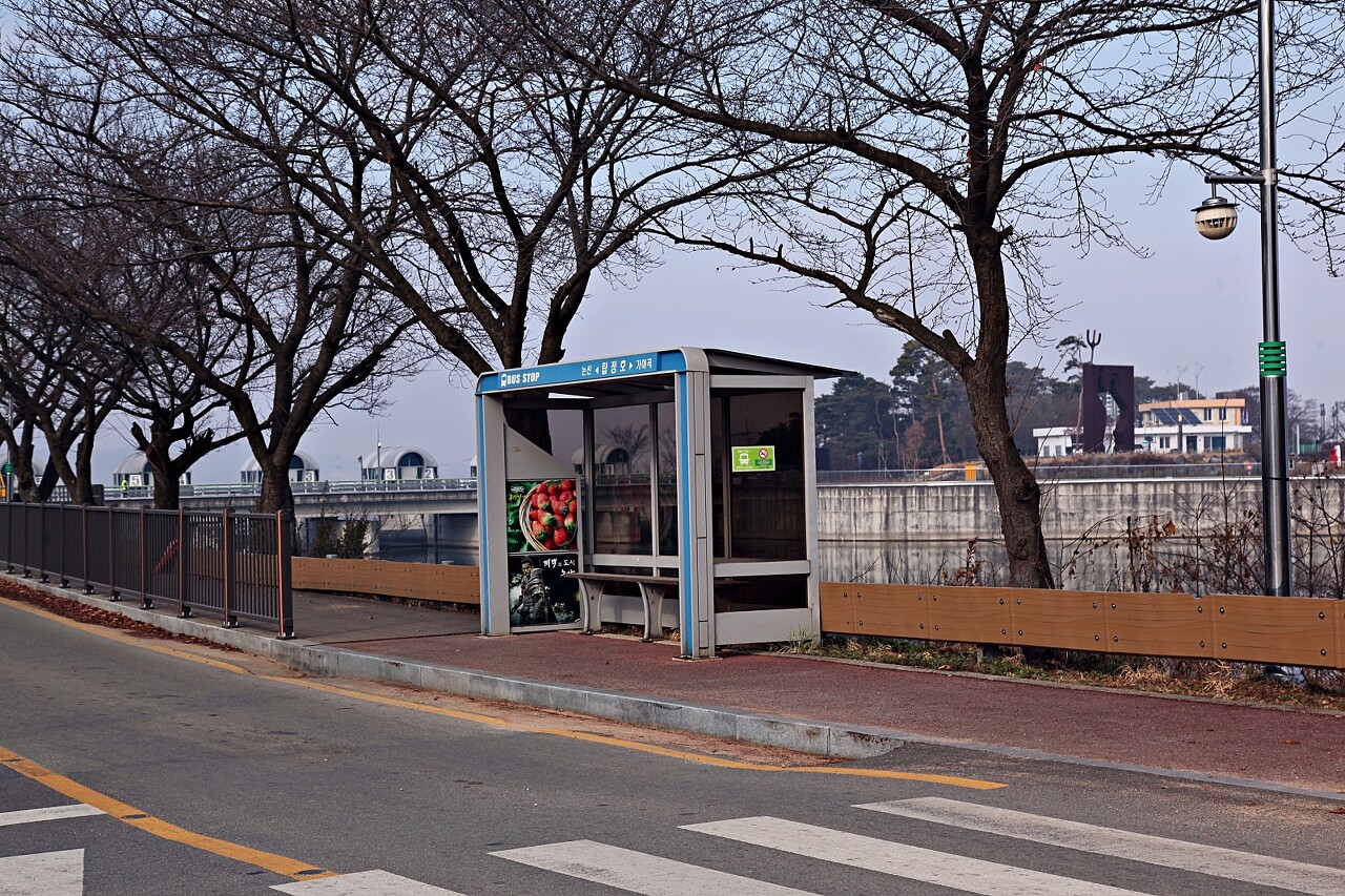 주말이나 휴일에는 탑정호 방문객을 위한 셔틀버스가 운행되고 또 논산에서 탑정호를 오가는 노선버스도 있습니다. 탑정호 제3주차장 앞 버스승강장입니다.