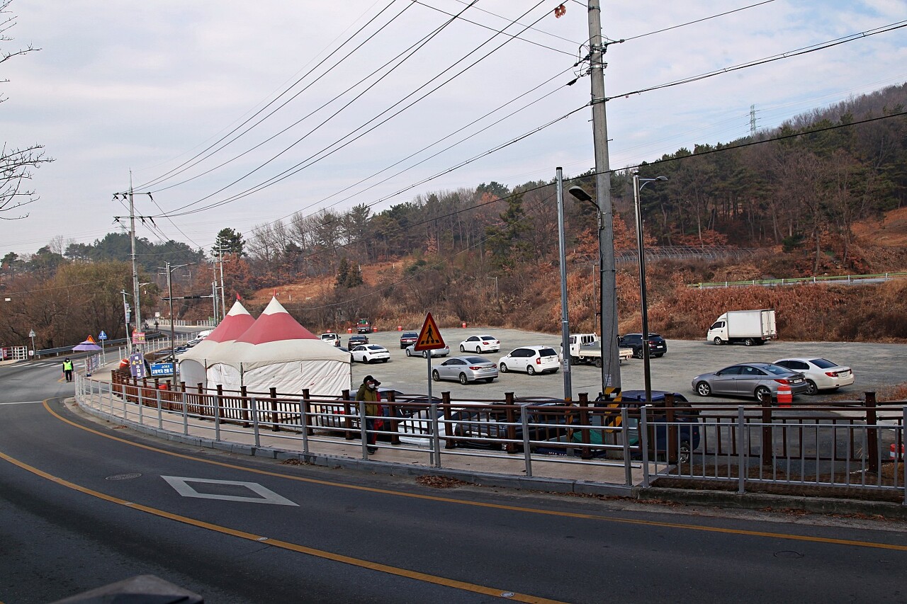 탑정호 북쪽 입구에 있는 주차장은 4-1주차장입니다. 이곳에서 탑정호 다리 북쪽 입구까지는 5분 정도 걸어가면 됩니다. 시간이 흐르면서 방문객의 차들이 늘어나고 있습니다. 잠시 주차하고 탑정호 다리로 이동합니다.