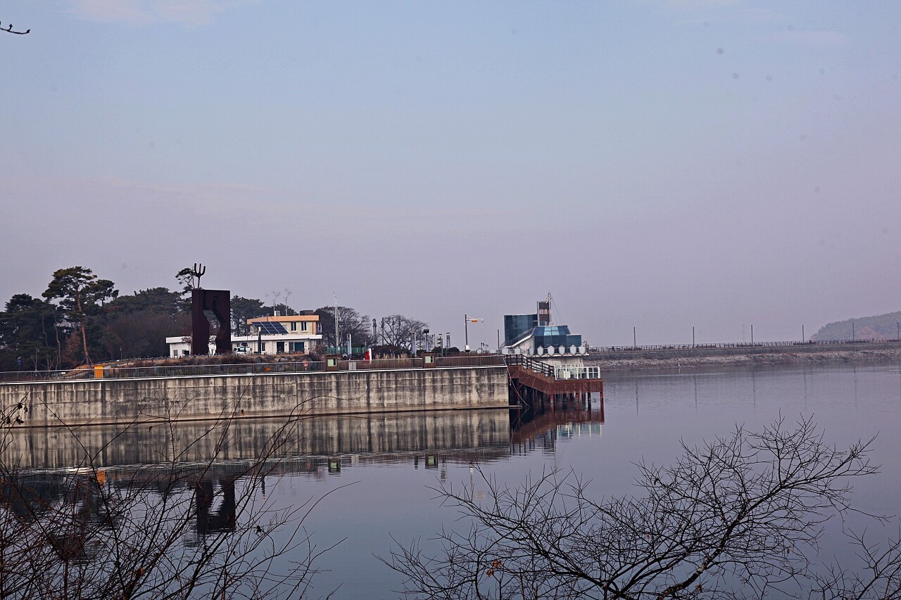 한국수자원공사 탑정호관리사무실 건물이 저만치 보입니다. 동계에는 중단되었지만 오른쪽 수면 앞에는 탑정호 음악분수대가 있어 탑정호의 밤을 즐길 수 있답니다.