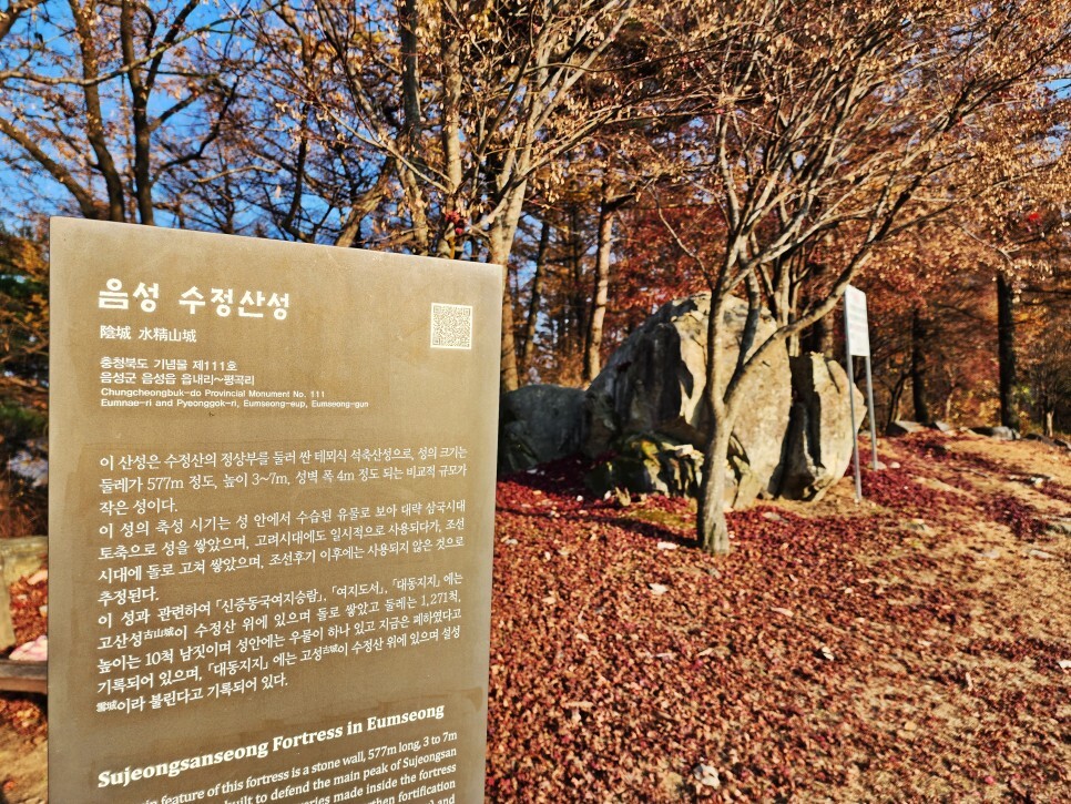 충청북도에는 보은 삼년산성과 청주 상당산성, 단양 온달산성 등 걷기 좋은 산성길이 많습니다. 오늘은 음성읍에서 가까운 거리에 있는 수정산성 둘레길을 걸으며 점점 멀어져 가는 가을을 배웅하며 계절의 변화를 느끼고 왔습니다.