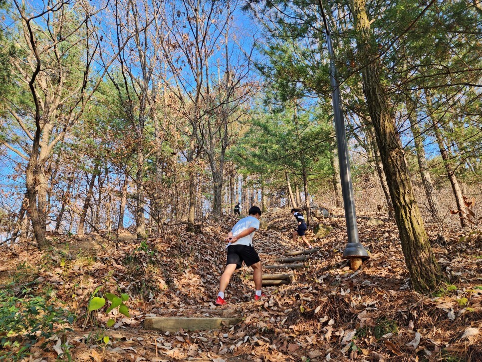 조금 빨리 정상으로 올라가고 싶은 마음에 둘레길에서 벗어나 가파른 계단길을 따라 올라가다 보니 숨이 차고 힘이 들었습니다. 훈련 중인 음성중학교 정구부 선수들이 정상까지 뛰어 올라갔다 내려오는 걸 보니 평소에 운동을 게을리한 것을 반성하게 됩니다.