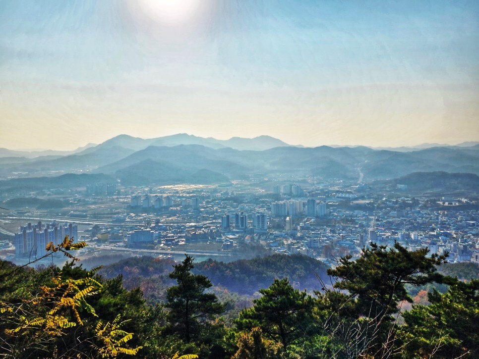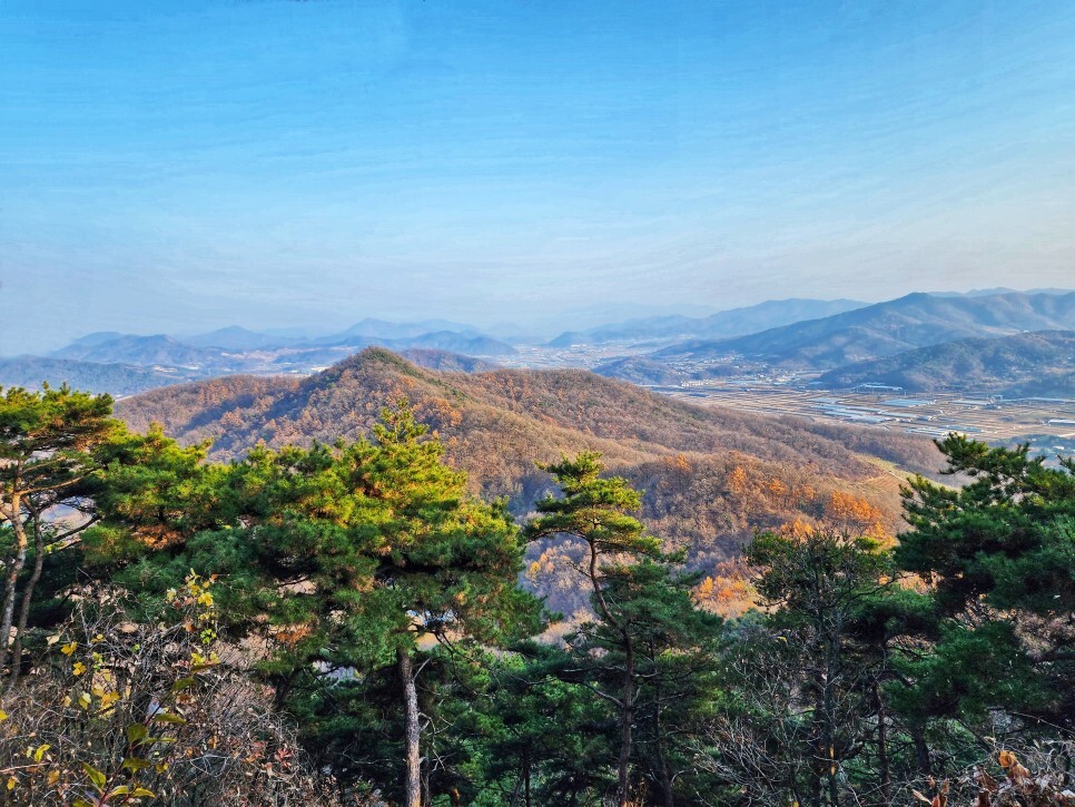 그러나 조금 더 올라가 수정산 정상 산불감시초소 앞에 서면 조금 전 정자에서 볼 수 없었던 멋진 풍광을 즐길 수 있습니다. 해발 709.6m의 가섭산과 봉학골산림욕장 등 수려한 산세가 병풍처럼 둘러싸고 있습니다.