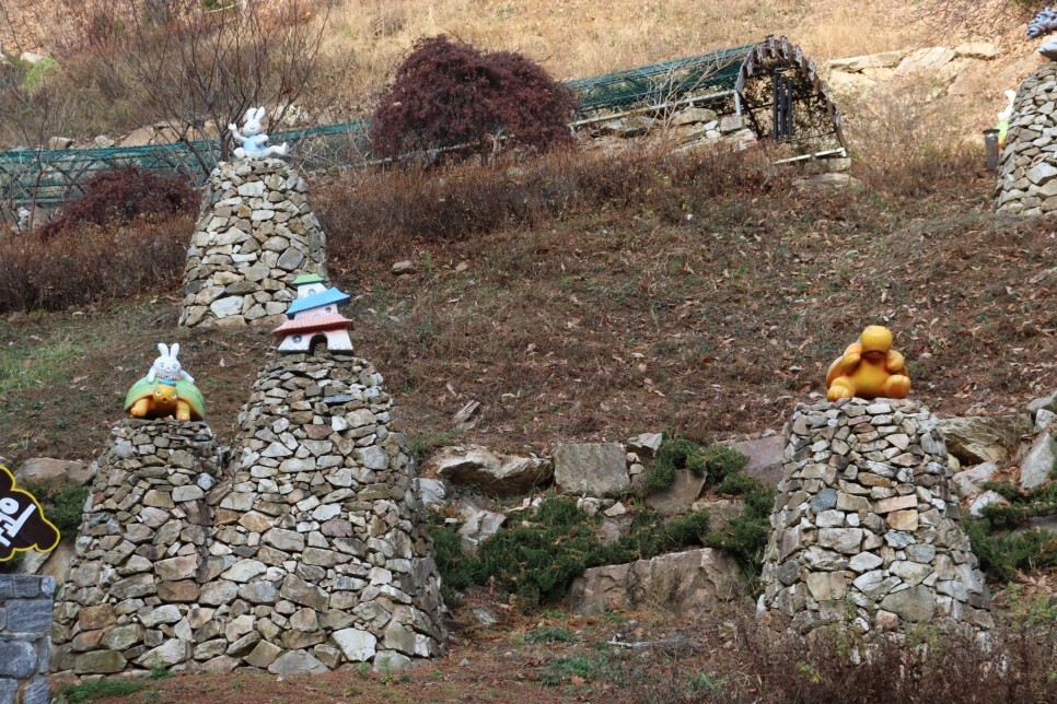 피톤치드가 느껴지는 숲길을 걷다보면 거북바위정원이 나타납니다. 귀여운 거북이 조형물도 있고, 거북이와 뗄레야 뗄 수 없는 관계인 토끼 조형물도 보입니다. 토끼와 거북이가 포옹하고 있는 조형물도 있는데, 거북이의 표정이 편안해보여서 마음이 몽글몽글해졌습니다.