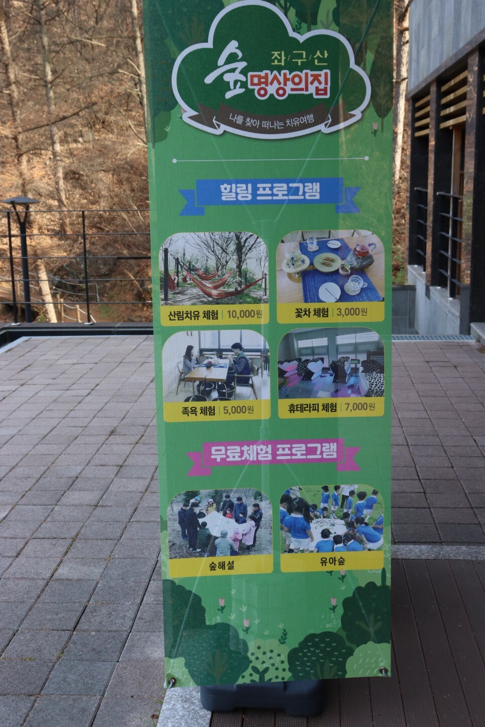 위쪽에는 집라인도 있고, 길을 따라 내려오면 명상의집 프로그램 안내판도 확인할 수 있습니다. 족욕 체험, 꽃차 체험 등 힐링 프로그램도 있고, 목공예, 가죽공예 등과 같은 공예체험도 가능합니다.