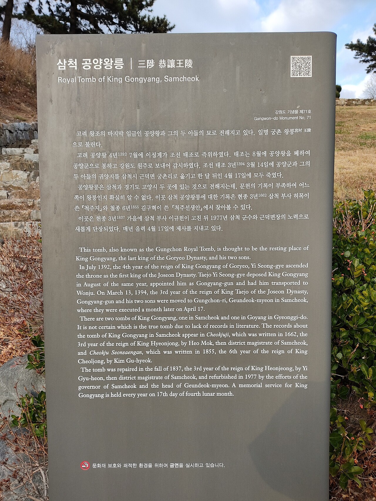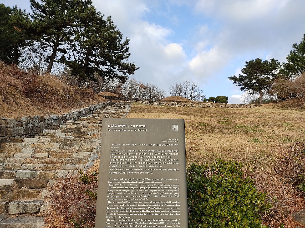 인터넷에서 찾아보니 고양시에 있는 공양왕릉의 경우 왕 좀더 나무가 풍성해보이고 비석같은것도 세워져 있는게 좀 더 왕릉인것 같다 싶다가도 궁촌에 있는 공양왕릉의 봉분이 별도의 석상이나 비석은 없지만 봉분 자체의 규모는 더 커보이는게 이게 왕릉인가 싶기도 합니다. 뭐 저는 삼척사람이니 삼척에 있는 공양왕릉이 진짜 공양왕릉이라고 믿겠습니다