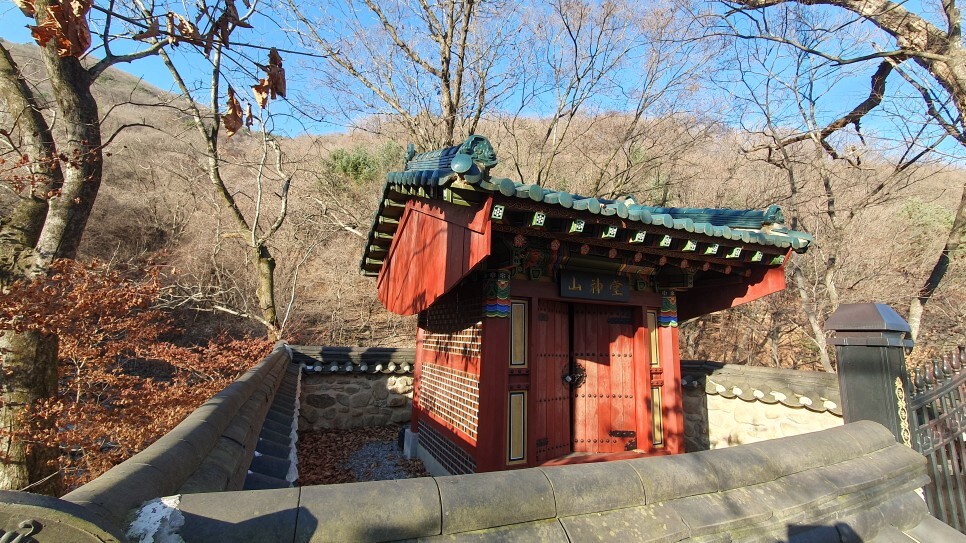▲오래된 나무들이 전각을 수호하는 것처럼 보이는 산신당의 전경