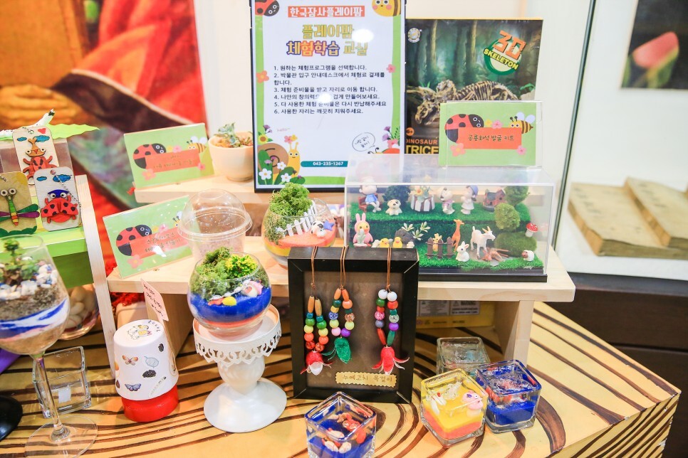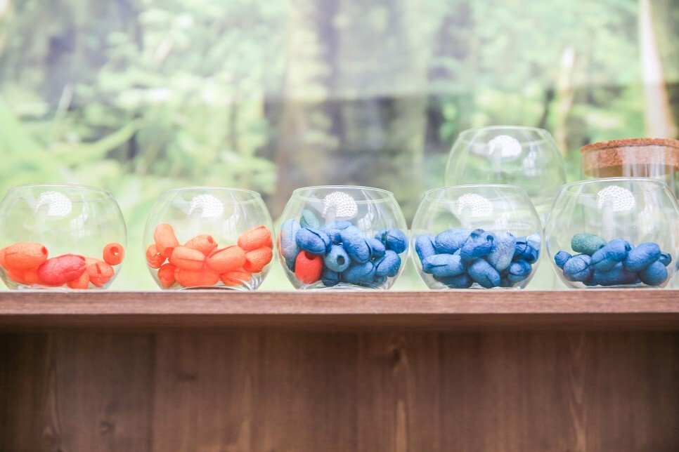 박물관에는 아이들이 오감으로 즐기는 체험프로그램도 있어요. 누에고치 목걸이 만들기, 젤리캔들 만들기, 오디 소금 만들기, 오디ㆍ뽕잎 비누 만들기 등 다양한 체험을 해볼 수 있습니다.