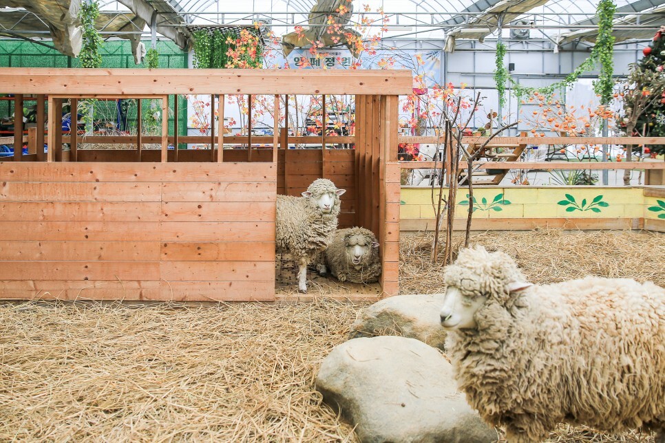 이번에는 귀여운 동물친구들을 만났어요. 비닐하우스에 들어가면 귀여운 양 4마리가 빤히 바라보며 눈을 마주칩니다.
