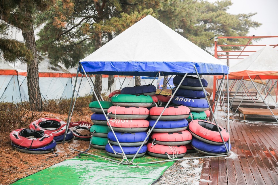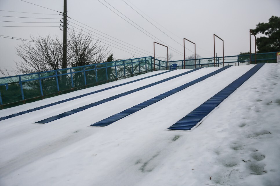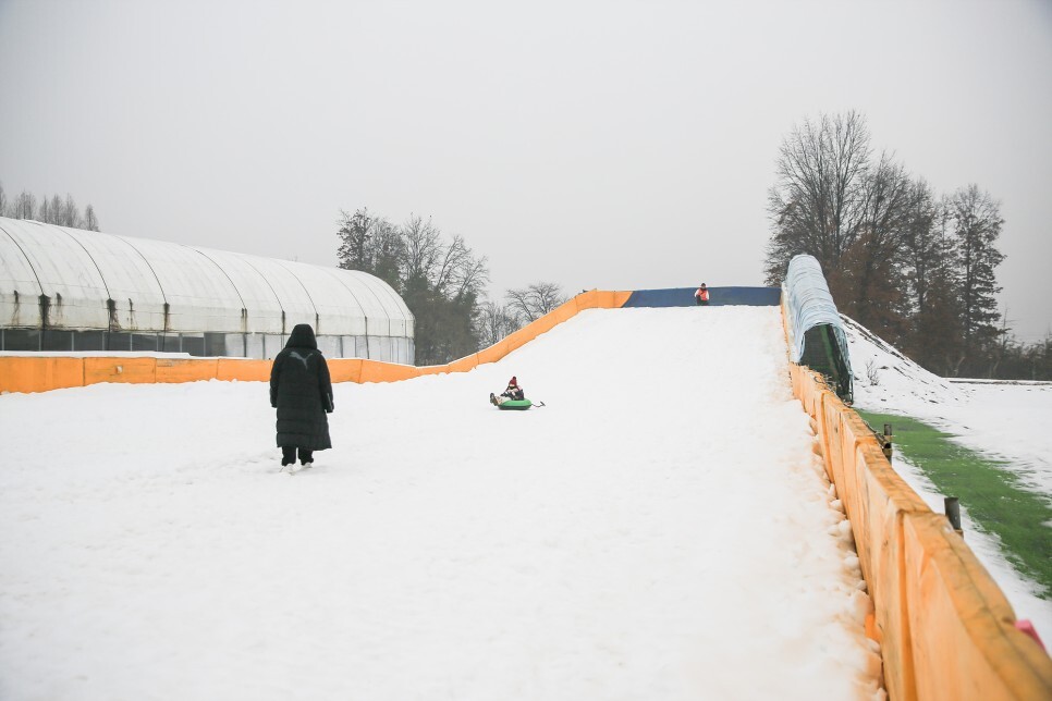겨울철에만 즐길 수 있는 눈썰매장도 개장했습니다. 눈썰매는 겨울에만 탈 수 있어서 겨울이 더욱더 기다려지게 되는데 날씨가 조금 궂은 평일에 찾았던 터라 눈썰매를 이용하는 사람들은 저희뿐이었어요. 눈썰매장에는 안전요원도 계셔서 안전하게 이용할 수 있습니다.