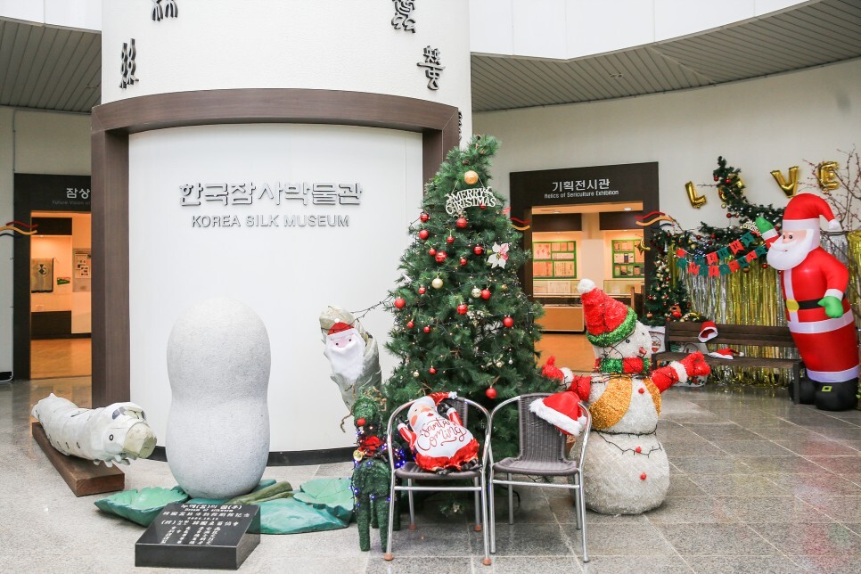 먼저 본관부터 소개해 드리겠습니다. 한국잠사박물관 본관은 겨울을 맞아 트리와 눈사람으로 포토존을 꾸며 두었어요. 예쁜 산타모자도 있으니 모자를 쓰고 사진을 남길 수도 있습니다.