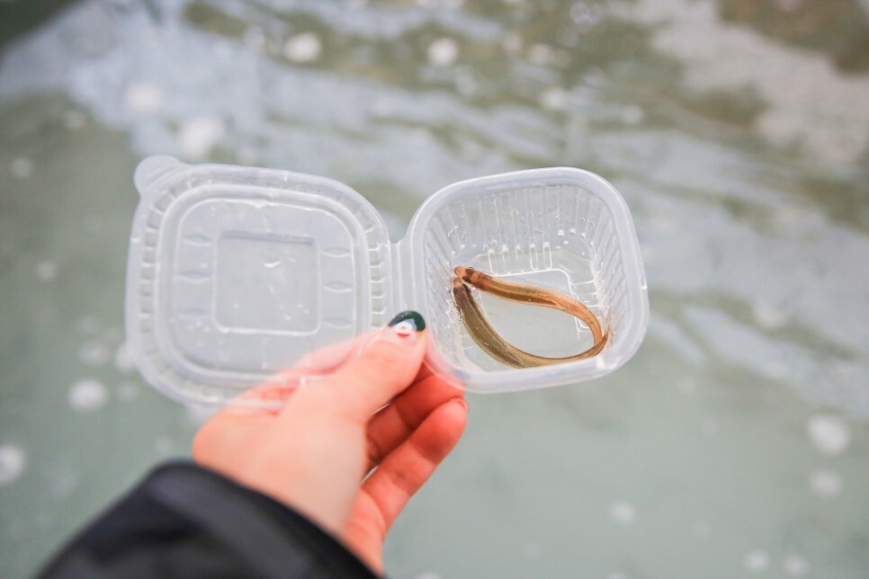 그리고 이곳에서 색다른 체험을 할 수 있어요. 바로 빙어잡기체험인데 물속에는 작은 빙어가 가득하고 뜰채로 빙어를 잡는 체험이에요. 재빠른 빙어를 뜰채로 잡기가 쉽지 않은데 꼭 빙어를 잡고 말겠다며 빙어와 신경전을 하는 아이가 너무 귀여웠어요.