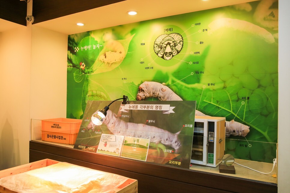 누에 몸을 자세하게 설명해 놓은 전시도 볼 수 있습니다. 어떻게 보면 징그럽기도 하고 어떻게 보면 귀엽기도 한 누에인데 상자 안에 알에서 깨어난 지 얼마 되지 않은 어린누에가 움직이는 모습을 볼 수 있어요.