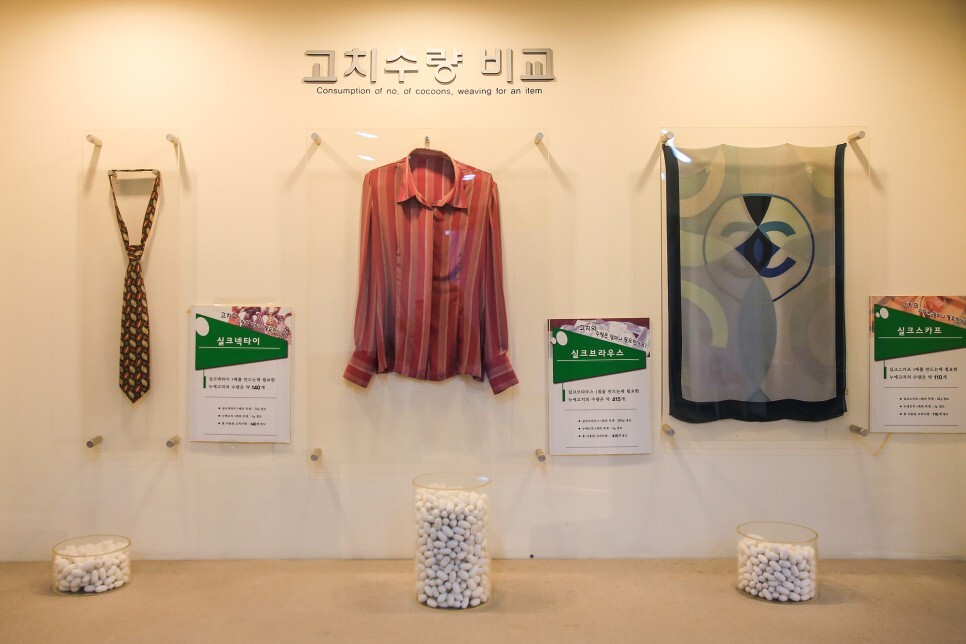 누에에서 실을 뽑아 실크원단을 만들어 가공하는 데에는 수많은 고치가 필요하다고 합니다. 실크넥타이, 실크블라우스, 실크스카프를 만들기 위한 고치수량도 비교해 놓았는데 실크블라우스 1점을 만드는 데에는 대략 415개의 고치가 필요하다고 합니다.