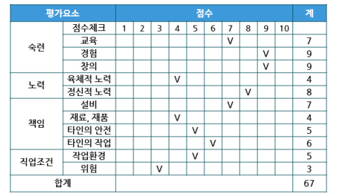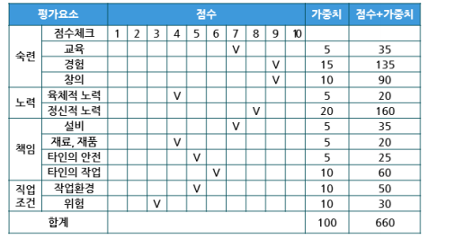수법은 직무의 평가요소를 선정하고 그 평가요소에 중요성 및 가중치에 따라 일정한 점수를