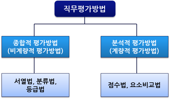 열법 분류법 점수법 및 요소비교법이 있다 서열법과 분류법은 비계량적 평가방법으로 점수법과 요소비교법은 계량적 평가방법으로 구분할 수 있다.