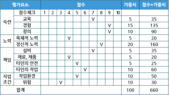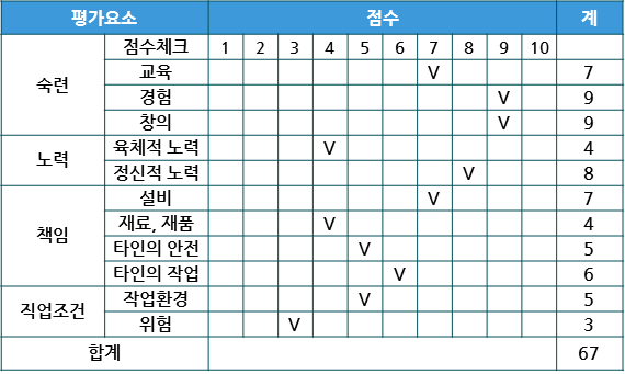 | 직무 | 정신적 요건 | 숙련 | 육체적 요건 | 책임 | 작업조건 |