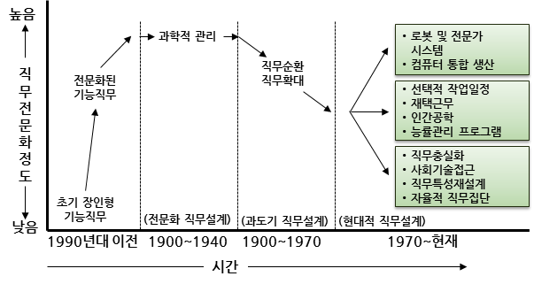 산업화 초기에서부터 현대에 이르기까지 직무전문화 단계 종업원 반응 접근단계 현대적 접 , ,