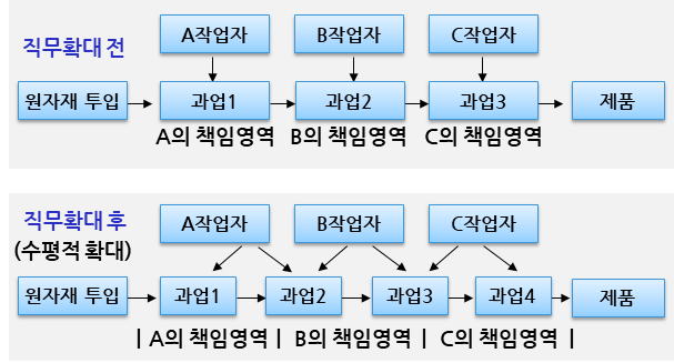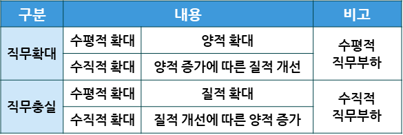 - 작업자에게 보다 많고 다양한 과업을 수행하게 함으로써 작업자의 학습 및 능력개발을 제