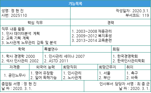 한 정보를 통합 정리한 기록으로서 종업원이 갖고 있는 기술능력경험훈련 , ․ ․ ․