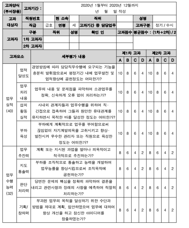 - 인사평가의 회수는 일반적으로 연 1-2회 정도이나 직종에 따라 3개월 또는 6개월 단위로