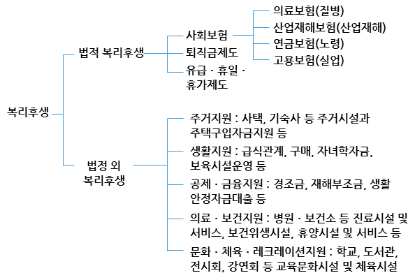 실시해야 하는 복리후생시설이나 제도를 말한다 따라서 그 범위와 종류는 국가의 사회보장 .
