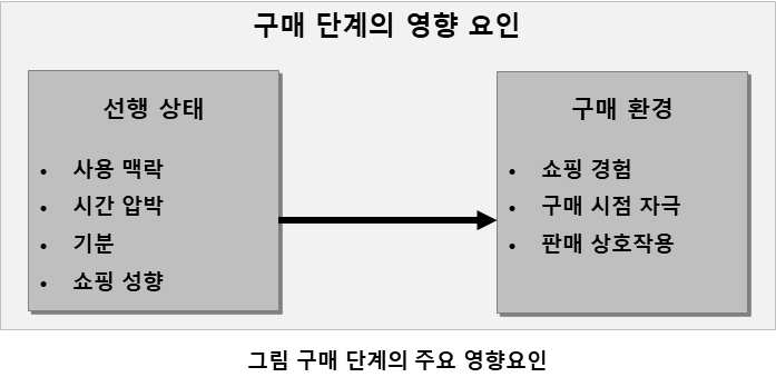 - 앞서 살펴본, 구매 단계의 영향 요인 중 구매 시점의 구매 환경 요인들과 관련되며, 소비