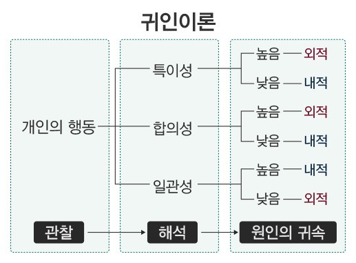 ♣ 행위 결과의 원인을 개인적 요인으로 돌리는 경우가 내적귀인이고 환경적 요인으로 돌리는