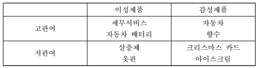 ♣ 저관여와 감성적 제품 : 기호품이 주종을 이루며, 개인적 취향을 만족시키는 제품으로 구성,