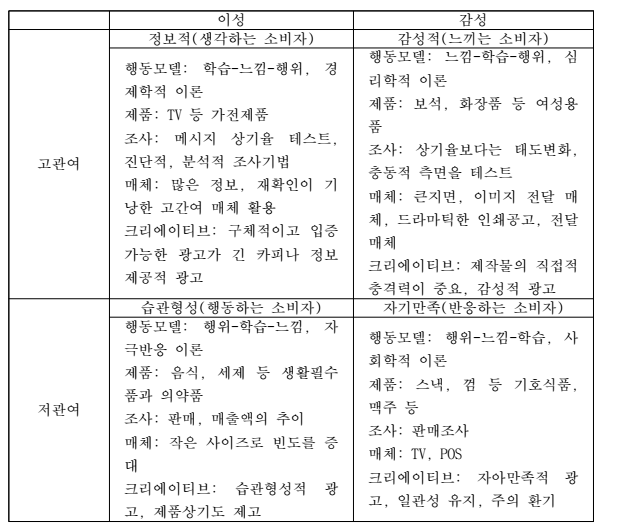 ♣ 고관여와 감성적 제품 : 제품의 감성적 측면이 정보나 태도보다 더 중요하게 인식, 느낌-학