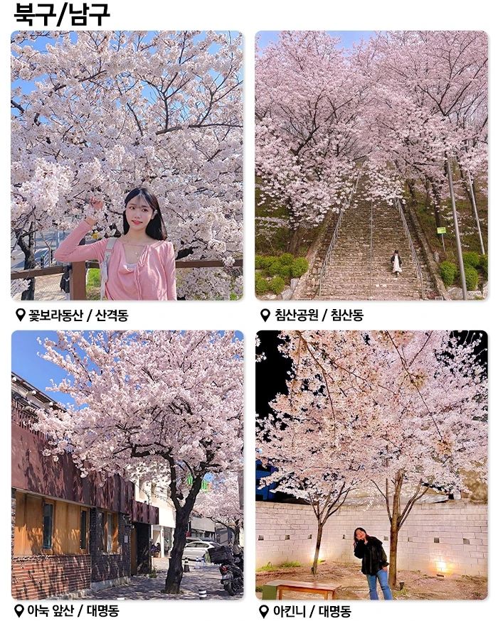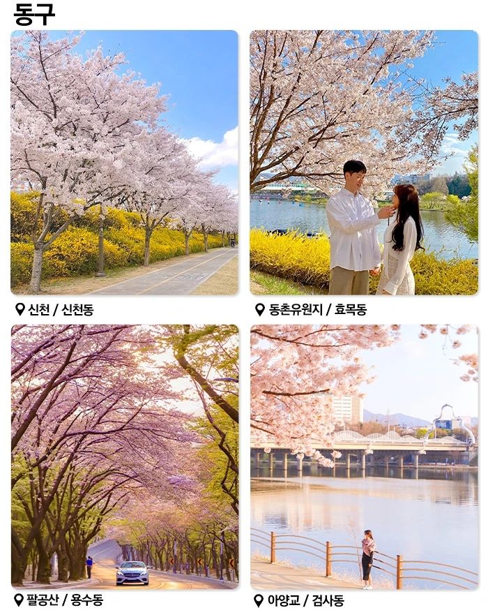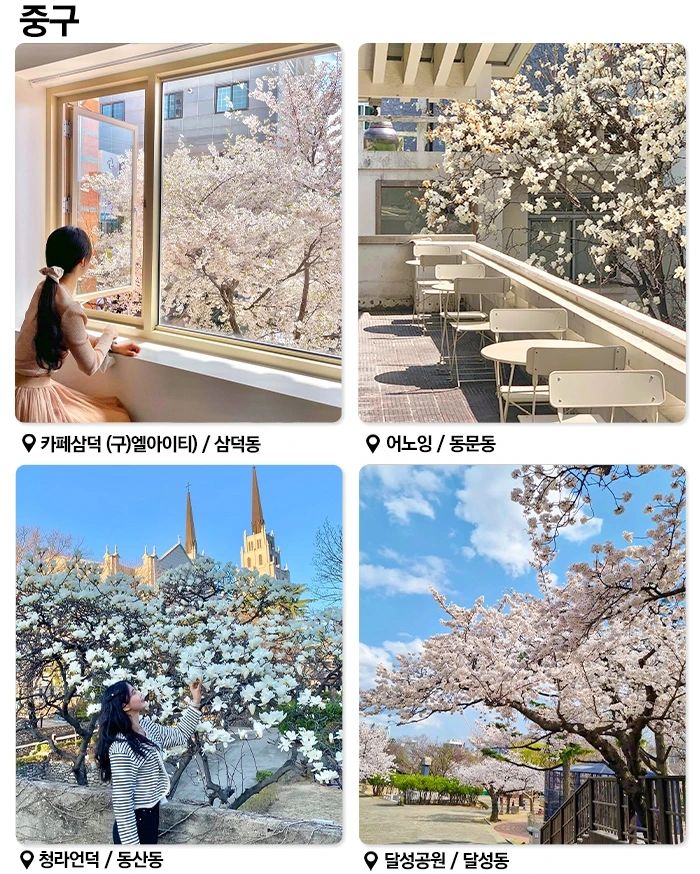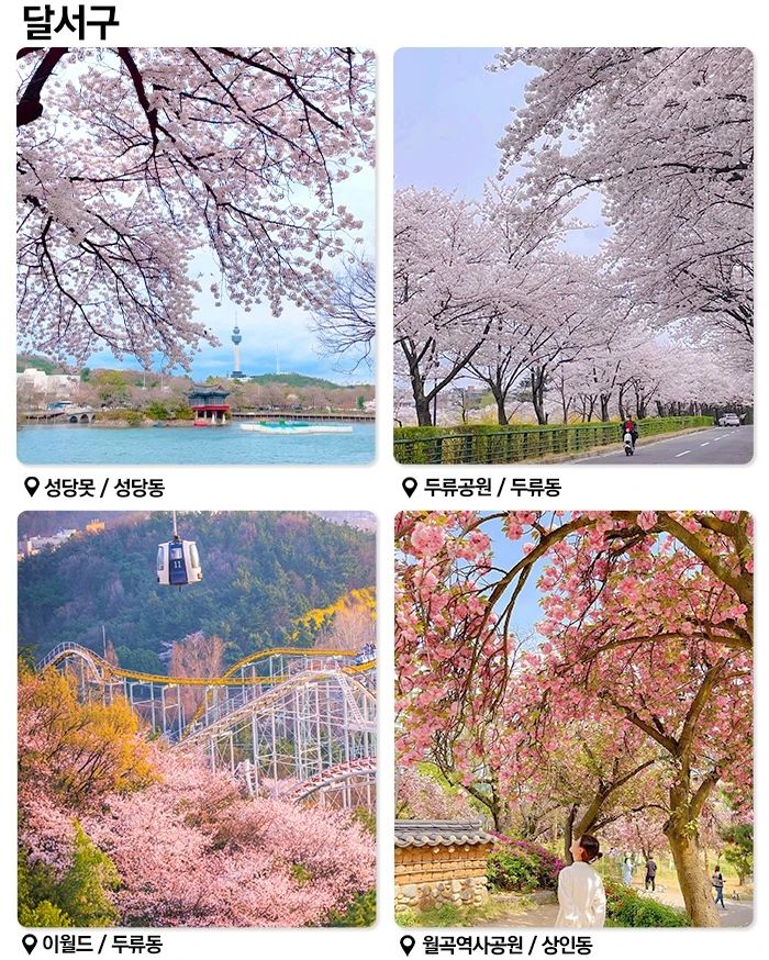 달성공원은 벚꽃을 감상하며 산책하기 좋은 곳입니다. 호숫가를 따라 조성된 산책로를 따라 걸으면 봄바람과 함께 흩날리는 벚꽃잎을 만끽할 수 있습니다. 또한, 연인들이 함께 사진을 찍기에도 좋은 포토존이 많이 마련되어 있습니다.