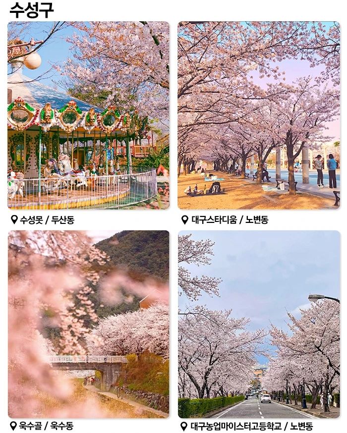 달성공원에서는 매년 벚꽃축제가 개최됩니다. 축제 기간에는 다양한 공연과 체험 행사가 열려 더욱 즐거운 시간을 보내 . 특히, 야간 조명이 켜진 밤에는 낮과는 또 다른 낭만적인 분위기를 즐길 수 있습니다.