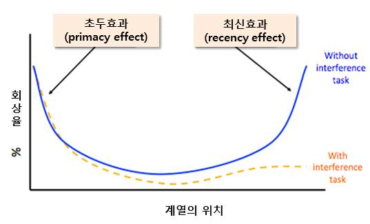 - 초두효과: 맨 먼저 제시된 항목들의 회상률이 높은 것