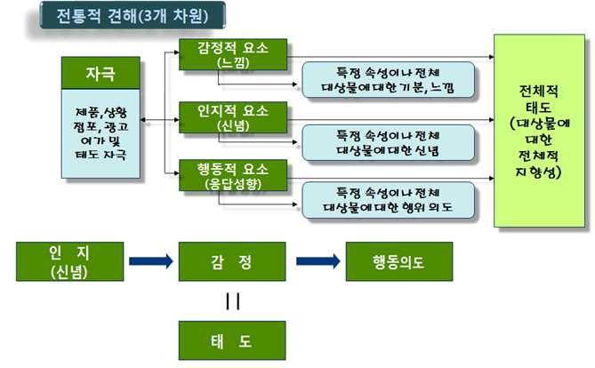(1) 전통적 견해 (삼각이론 ) : 태도 = 인지(Cognition)+감정(Affect)+의욕(Conation)