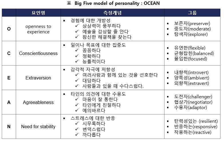 ♣ 경험에 대한 개방성(Openness to experience), 성실함(Conscientiousness), 외향성
