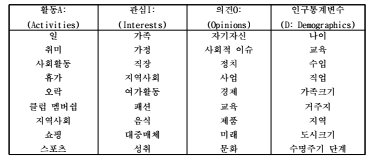 중 하나이며, 싸이코그래픽스를 이용한 라이프스타일 측정에는 일반적으로 AIO 측정 목록